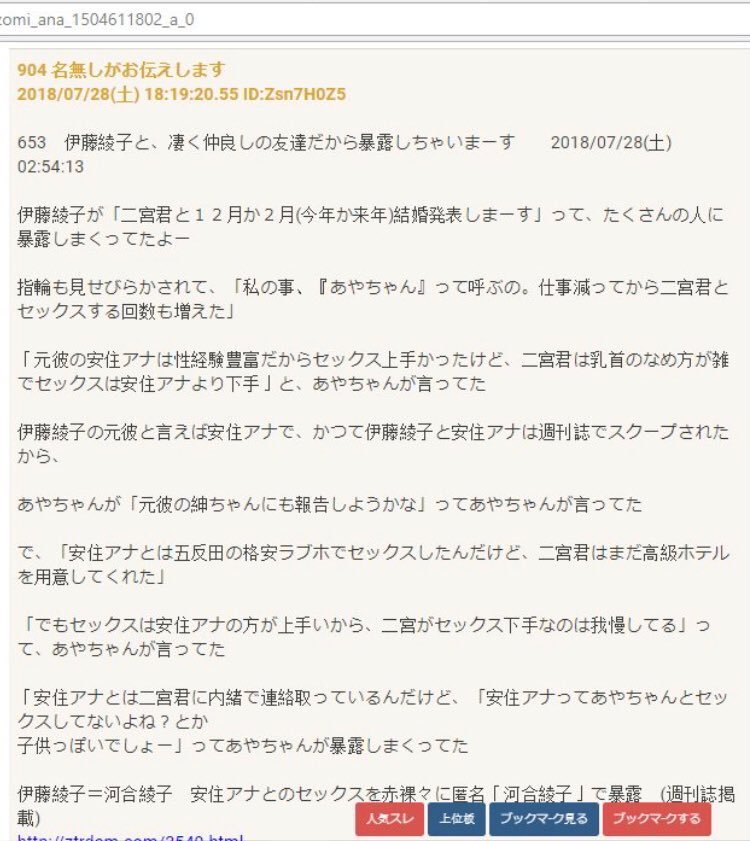 内容の真偽はいまのところ不明ですが、非常にリアリティのある文章です。二宮が伊藤綾子に操られている様子が伺えますが、結婚の経緯を見るとこのタレコミが真実なのではと思えることもあります。