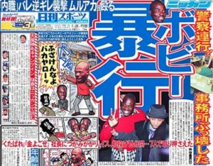 ボビー・オロゴンは2006年に政治家・鈴木宗男の元秘書ジョン・ムウェテ・ムルアカ氏に暴行した疑いで書類送検されています。