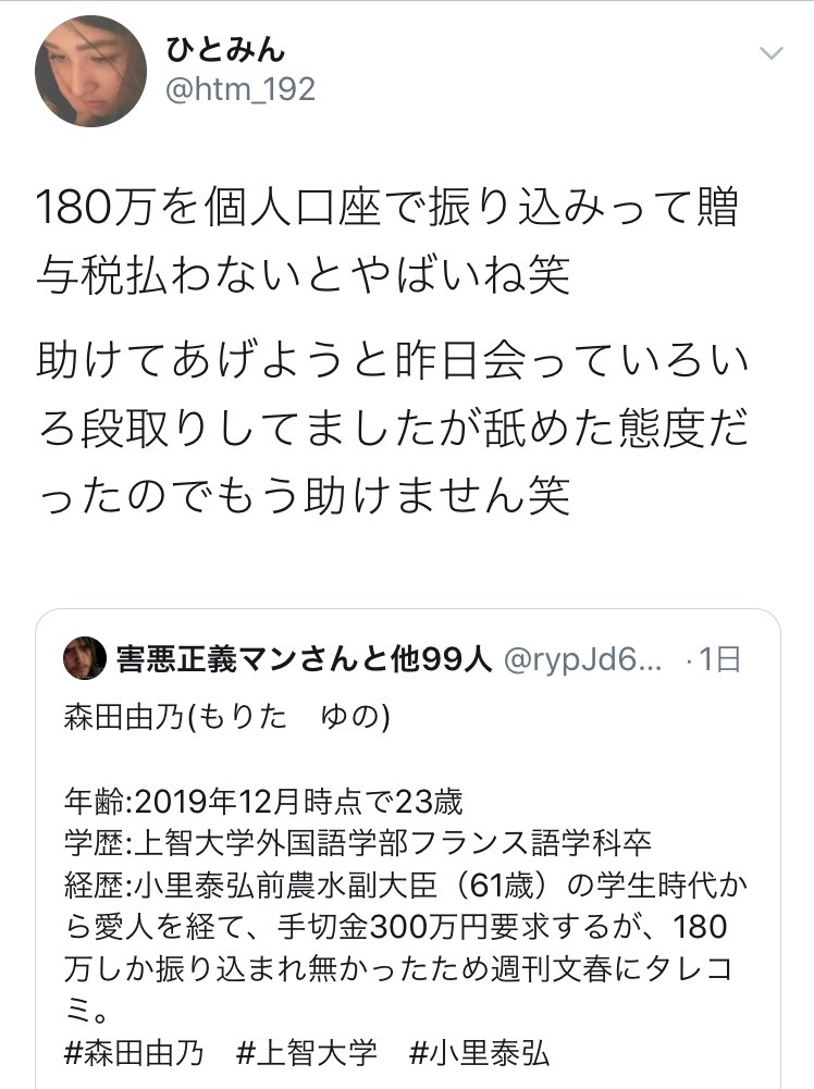 「週刊新潮」報道前後の森田由乃の様子を、パパ活界の大物として知られる「ひとみん」が暴露しています。